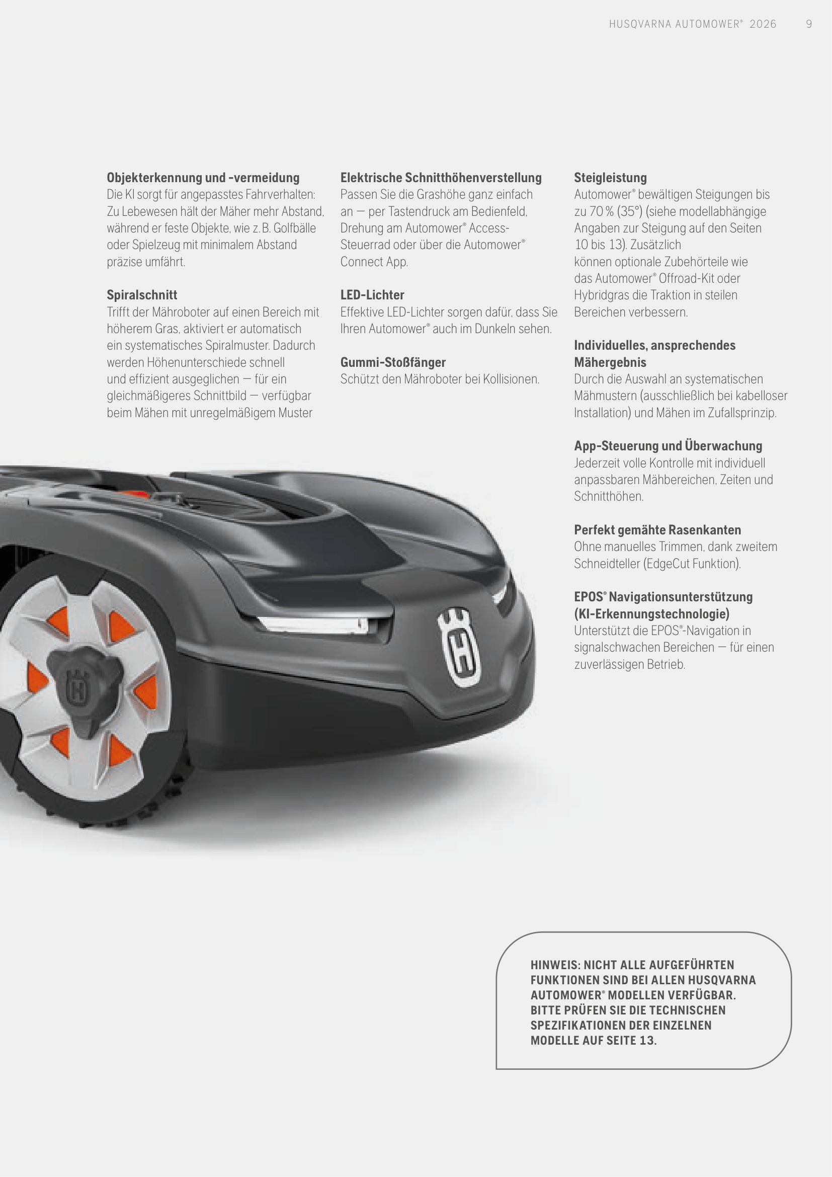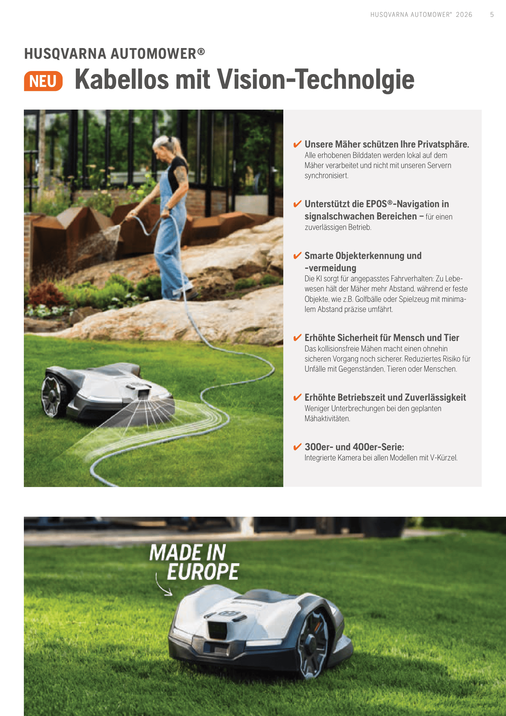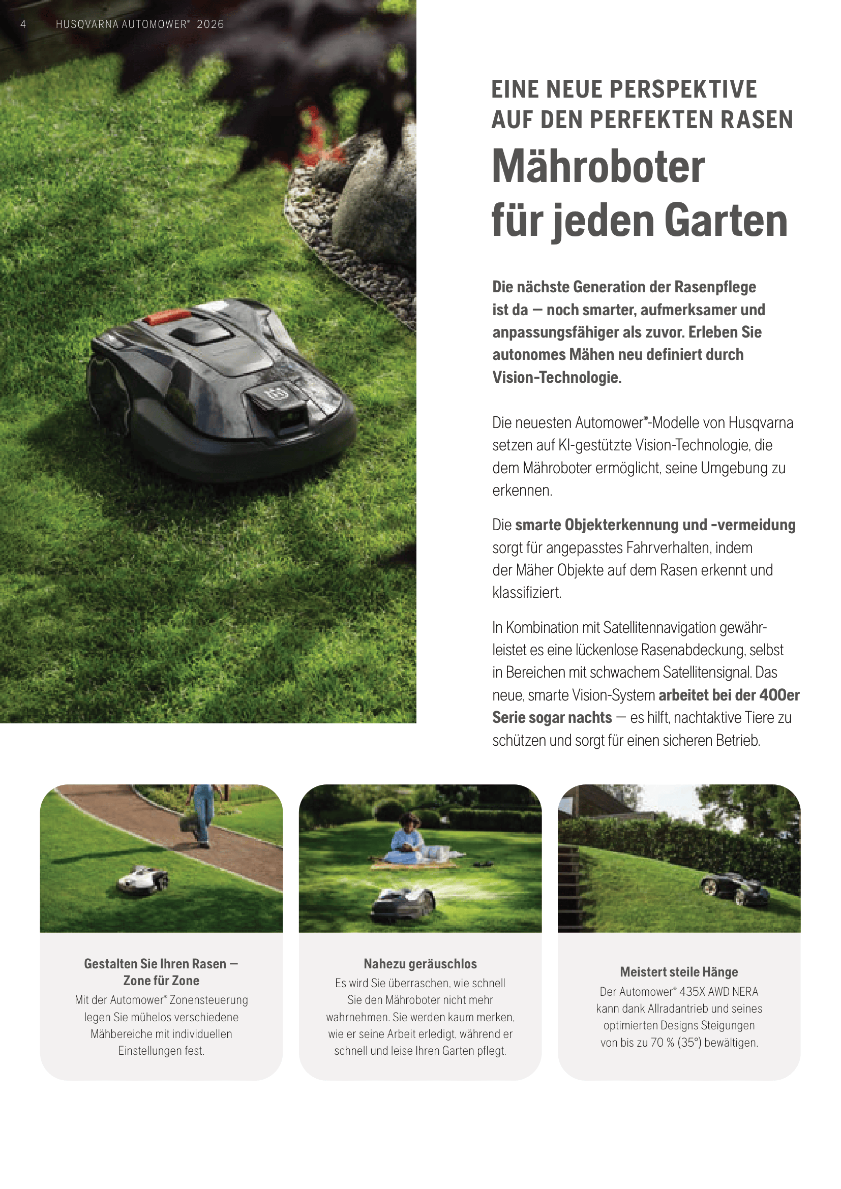 Die Zukunft der Rasenpflege ist nicht nur nahe – sie geht neue Wege. Smarter. Schärfer. Intelligenter als je zuvor. Lerne die neue Generation von Husqvarna Mährobotern mit KI-gestützter Erkennungstechnologie kennen, die in Echtzeit sieht, versteht und sich anpasst. Seit Jahrzehnten ist der Husqvarna Automower® Mähroboter führend in der Rasenpflege. Jetzt werden die Regeln neu geschrieben: dank der KI-gestützten Erkennungstechnologie können die neuen Mähroboter ihre Umgebung sehen und verstehen. Sie folgen nicht nur einem Muster. Sie reagieren auf die Welt um sie herum. Ob es sich um ein Spielzeug handelt, das auf dem Rasen zurückgelassen wurde, Gartenmöbel oder einen nachts vorbeischauenden Igel – dein Mähroboter weiß, wie er sich verhalten muss, und mäht intelligent und ohne Unterbrechung. Das Ergebnis sind ein noch besser gemähter Rasen und weniger unerwartete Stopps.