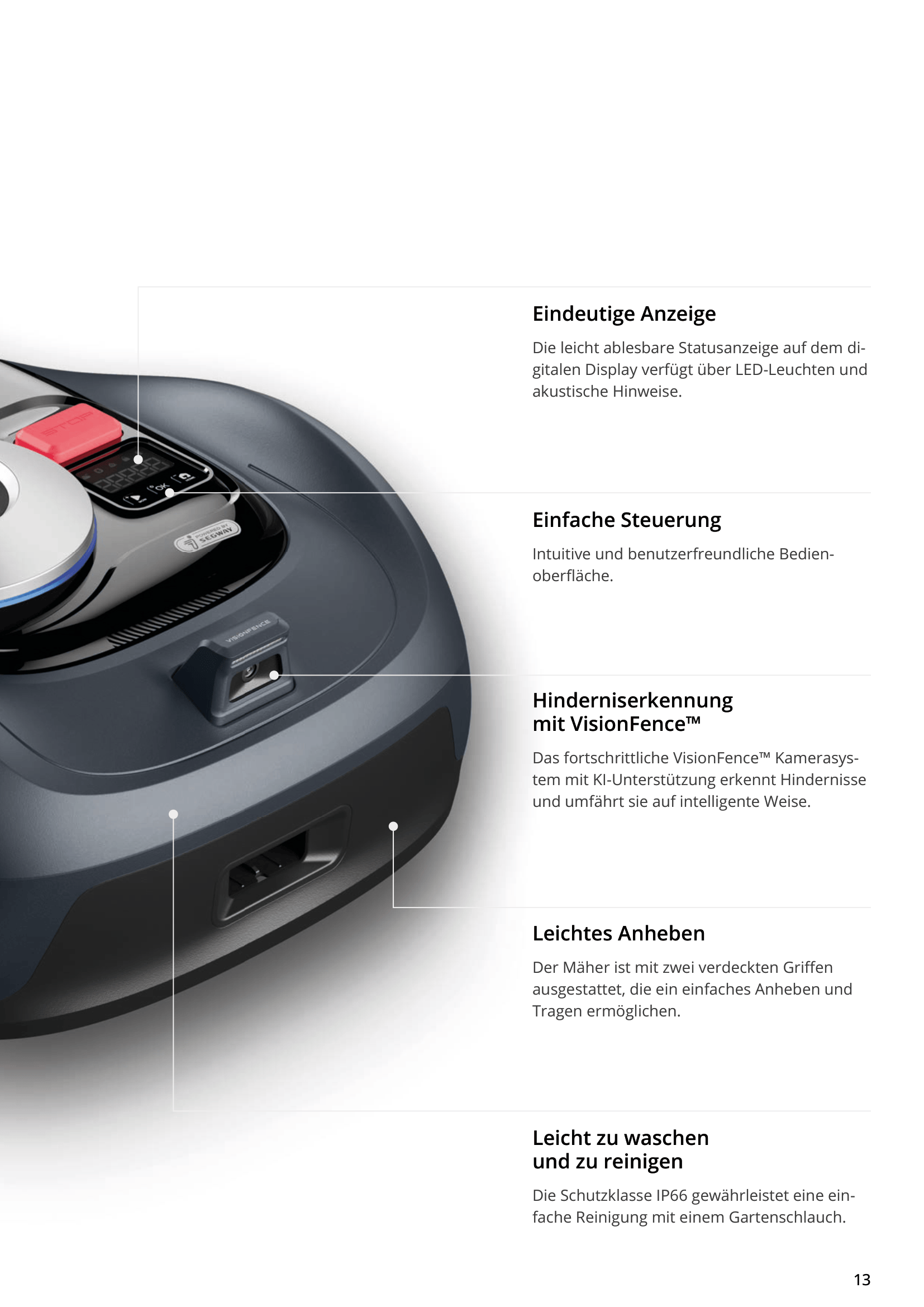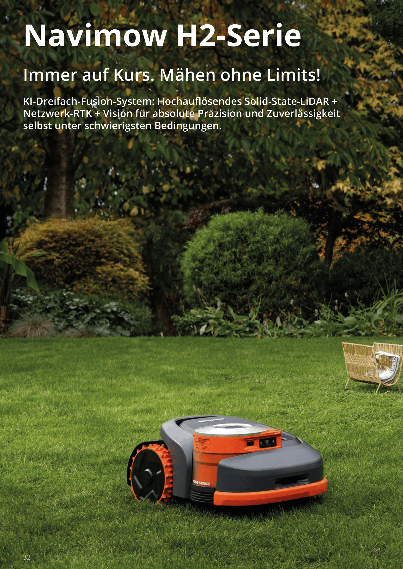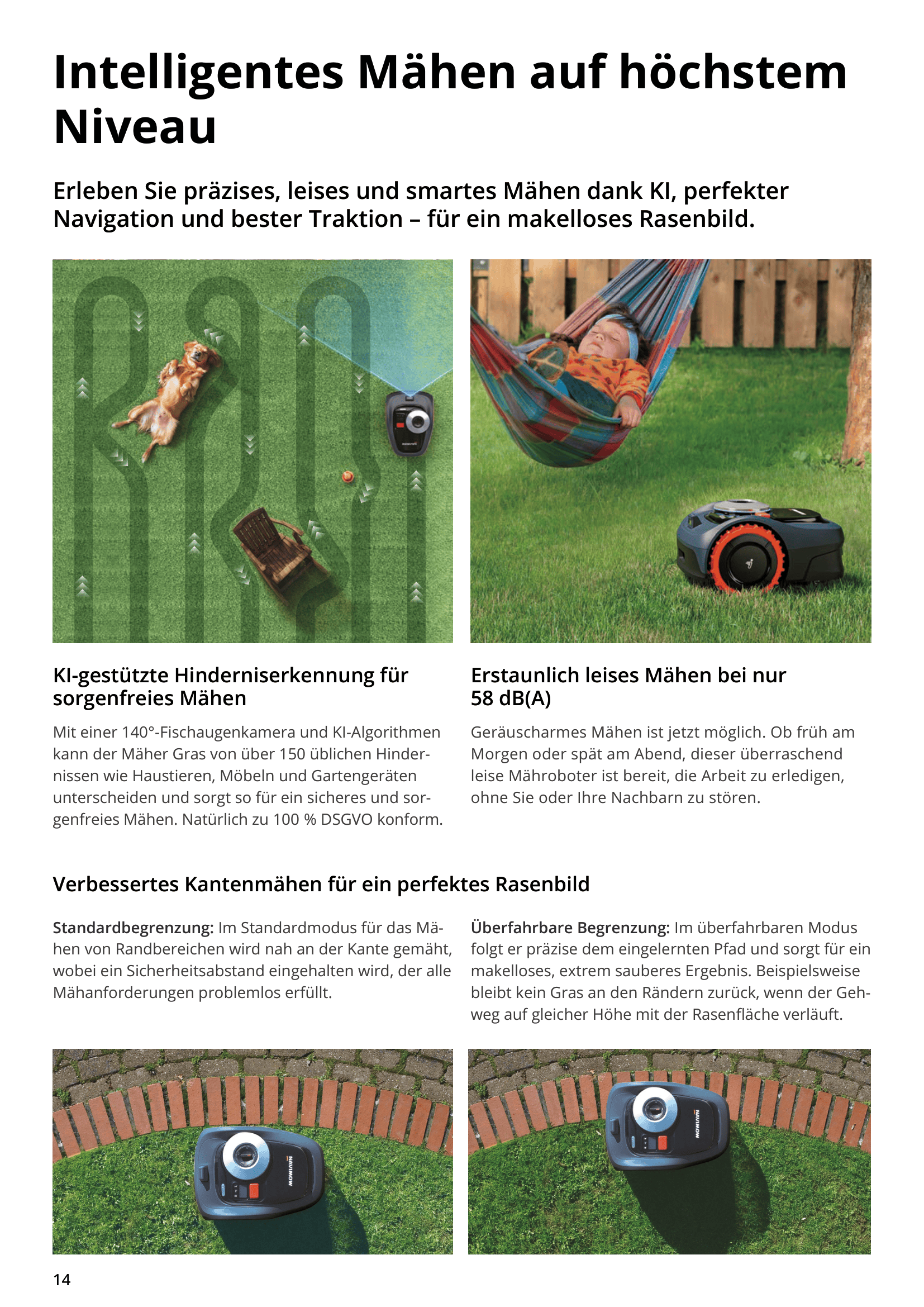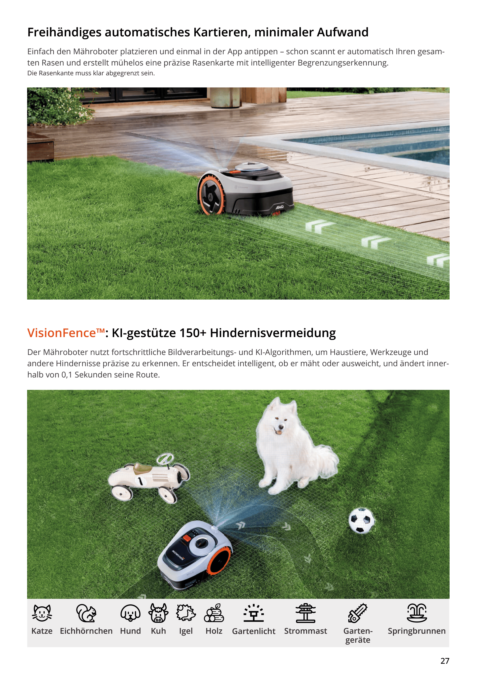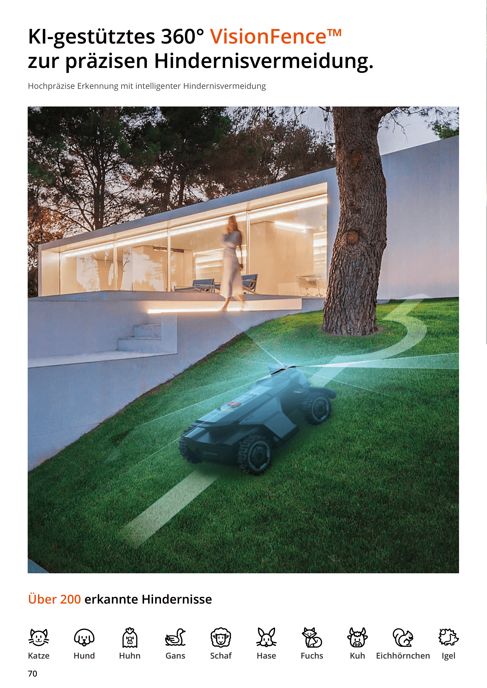 Konzipiert für kleinere Gärten. Ausgestattet mit 140°-Weitwinkelkamera, KI-Algorithmus und VisionFence™.